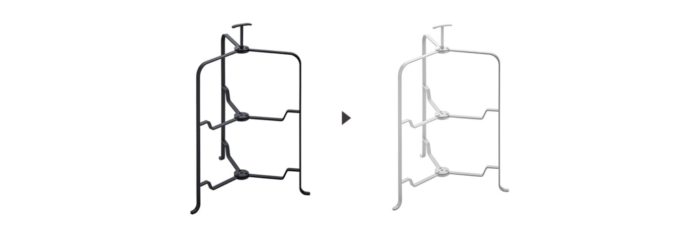 折りたたみ式ティースタンドをお使いでキズが気になってきたと感じるお客様にこそ、このシステムがおすすめ。新規に買い直すより、手ごろな値段でマットシルバーやゴールドに塗り替えることができます。